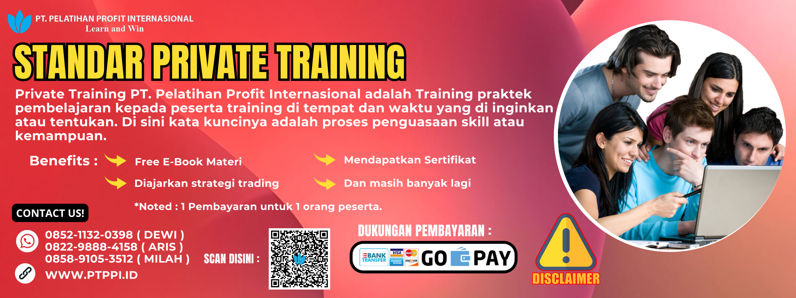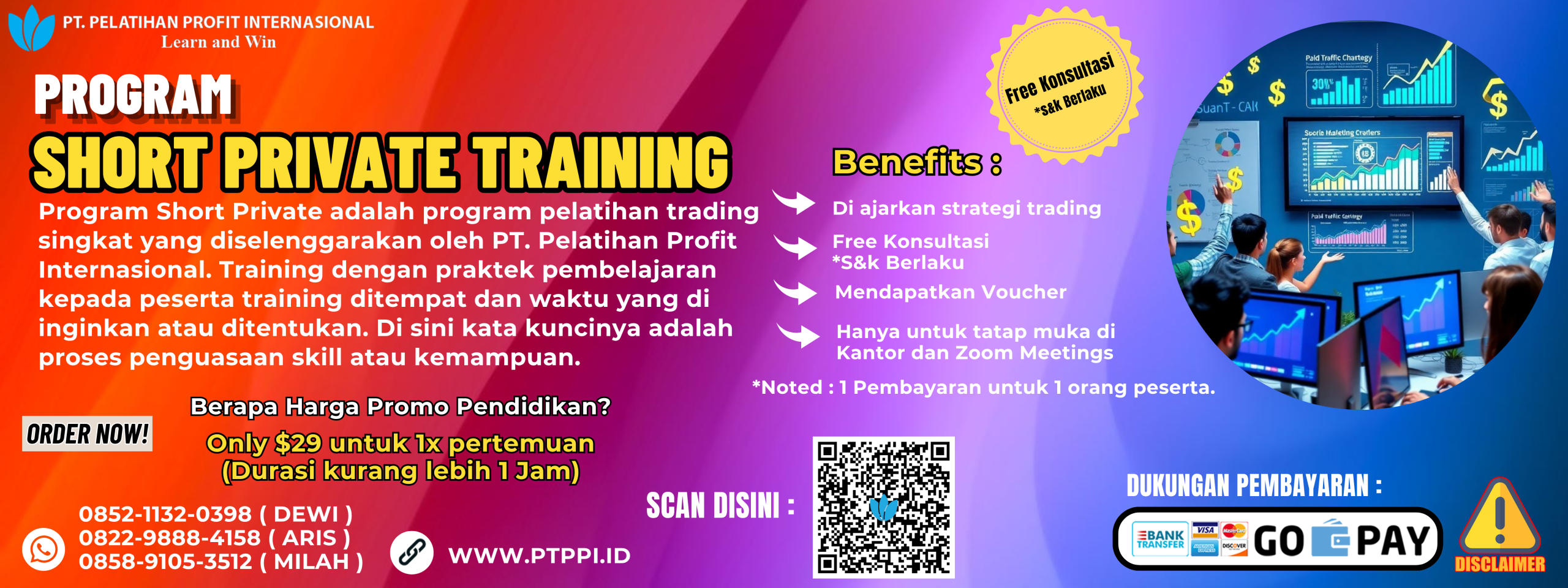 PT. Pelatihan Profit Internasional (PTPPI) memberikan layanan edukasi, pelatihan, dan pendampingan terkait trading serta pengelolaan keuangan. Segala materi, strategi, maupun contoh yang diberikan hanya bertujuan sebagai sarana pembelajaran.