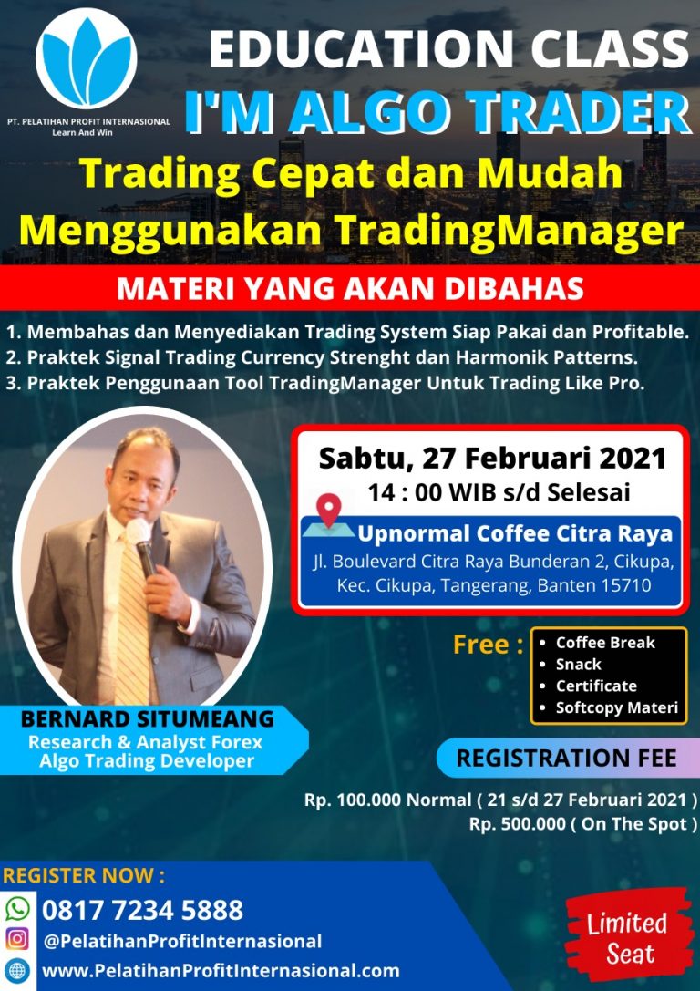 Pada tanggal 27 Februari 2021 PT. Pelatihan Profit Internasional telah mengadakan education class bersama dengan Bapak BERNARD SITUMEANG dari Pelatihan Profit Internasional dengan tema: Forex Education Class yang bertemakan tentang “I’M ALGO TRADER – Trading Cepat dan Mudah Menggunakan TradingManager”…
