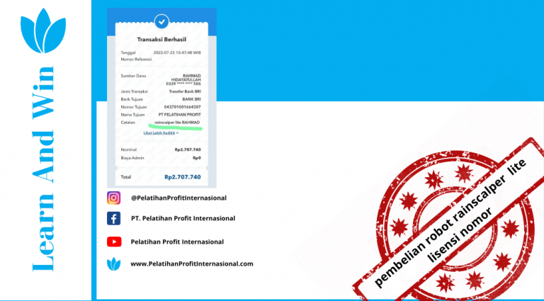 Terima kasih bapak Rahmad Hidayatullah Mataram atas pembelian robot rainscalper lite lisensi nomor $180 X 15.043,00 menjadi RP.2.707.740,00, Semoga Bapak profit terus menggunakan robot rainscalper lite lisensi nomor kami, AMIN. Segera daftar jadi member kami sekarang !! (PROMO TERBATAS Sampai…