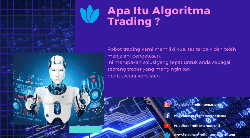 Keunggulan menggunakan algoritma trading adalah anda akan mendapatkan profit yang lebih pasti, terhindar dari keterlibatan emosi, terhindar dari sikap serakah dan terhindar dari rasa takut akan kehilangan modal. Algoritma Trading akan menempatkan semua proses dalam metode otomatis dan trader tidak perlu menempatkan order secara manual. Semua sudah terprogram dan waktu yang akan mengeksekusi dengan sistem yang mampu mengidentifikasi peluang yang muncul lalu otomatis membuka posisi jika setup yang muncul sesuai kriteria. Dalam hal tingkat transaksi, algoritma trading sering menggunakan teknologi perdagangan yang memiliki frekuensi tinggi dan memungkinkan anda untuk membuat puluhan ribu transaksi per detik karena otomatisasinya algoritma trading membuat pasar lebih likuid dan proses trading menjadi lebih sistematis dengan tidak meninggalkan dampak emosi pada manusia saat aktivitas trading. Kami PT. Pelatihan Profit Internasional yang merupakan perusahaan bergerak di bidang Edukasi Trading yang Legal dan Resmi di Indonesia, menyediakan Jasa Pembuatan Robot Trading (Expert Advisor). Robot trading otomatis dengan fitur-fitur canggih di dalamnya, akan dapat membantu anda untuk trading secara otomatis. Robot trading kami di buat langsung oleh programer handal yang telah banyak membuat robot untuk trader-trader di Indonesia bahkan sampai trader Luar Negeri. Robot trading kami memiliki kualitas terbaik dan telah menjalani pengetesan. Ini merupakan solusi yang tepat untuk anda sebagai seorang trader yang menginginkan profit secara konsisten.