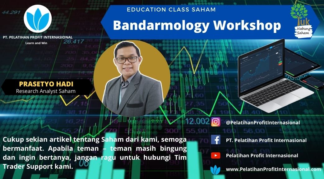 Pt. Pelatihan Profit Internasional akan mengadakan edukasi class saham dengan tema Bandarmology Workshop nah dalam pembahasan nanti akan menampilkan Prasetyo Hadi sebagai research saham untuk pembahasan pada tgl 23 Januari 2021 nanti yang bertepatan di Upnormal Coffe. Bandarmology merupakan sebuah analisa dengan mendeteksi transaksi harian bahkan mingguan yang terjadi terhadap saham yang sedang kita incar. Dalam metode ini kita mendeteksi apakah sedang terjadi akumulasi yang dilakukan oleh para mereka yang dikatakan pemain besar bisa (Individu maupun Corporate) yang memiliki dana tidak sedikit untuk masuk ke instrument saham yang sedang mereka incar untuk masuk ke portofolio mereka.