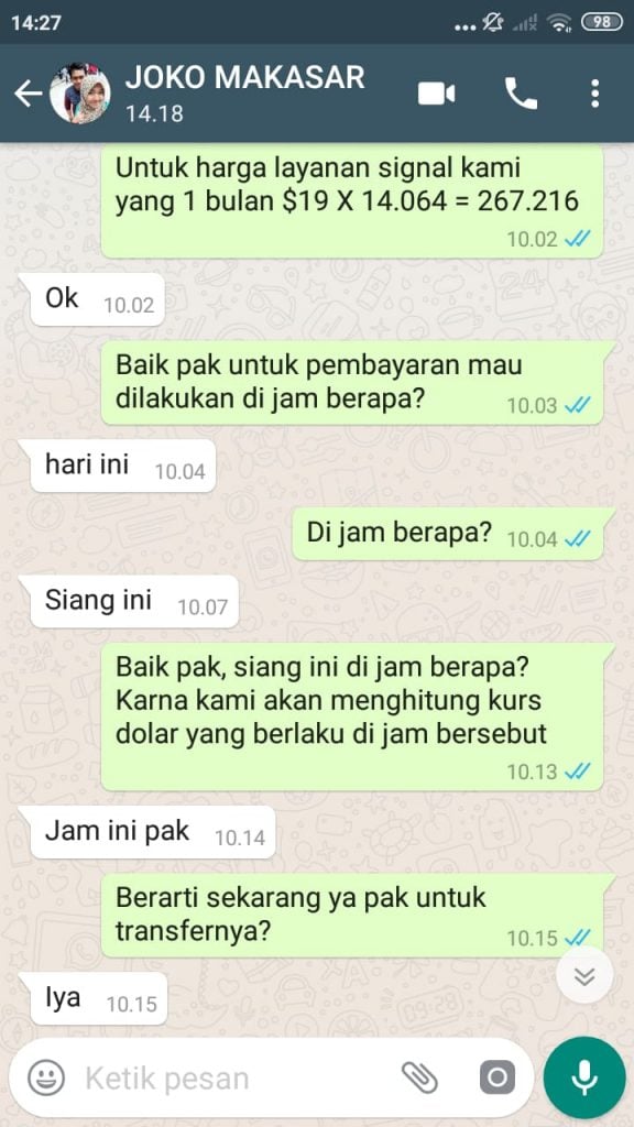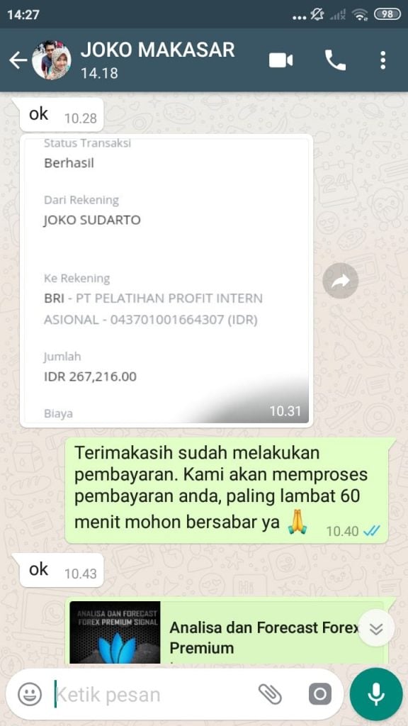 Pada tanggal 12 November 2019, Bapak Joko Sudarto dari Makasar telah berlangganan signal forex kami selama 1 bulan, sebesar Rp.267.216 dan berlaku sampai dengan 12 DESEMBER 2019.