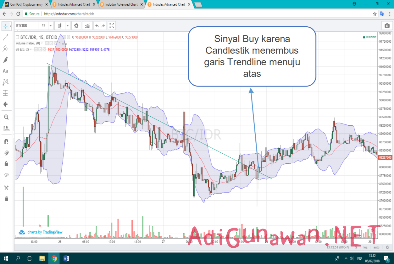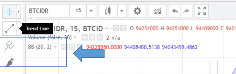 Strategi untuk memprediksi dan menemukan kapan akan terjadi pembalikan harga bitcoin sebagai dasar untuk melakukan transaksi Beli atau Jual. Setelah memilih indikator Bollinger Bands, tambahkan juga garis trend/Trendline. Untuk membuat garis trend kita membutuhkan paling sedikit 2 titik Puncak ataupun 2 titik Lembah pergerakan harga terakhir.