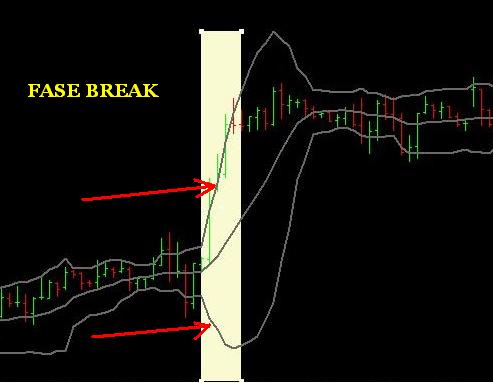 Kondisi break ditandai dengan pita atas dan bawah melebar menjauh .Ini terjadi karena membludaknya order sehingga tenaga market begitu besar . Dampaknya market akan bergerak lurus. Pada fase break tidak mungkin terjadi pembalikan arah trend secara normal, keculai terjadi konvergen . Strategi yang cocok pada kondisi seperti ini adalah strategi breakout.