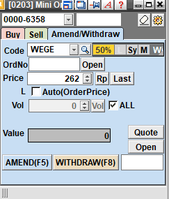 Klik order sebelumnya pada kolom kemudian pilih harga pada 262 dan isi volume antrian sebelumnya (bisa semua atau berapapun yang ingin anda pindahkan antrian di LOT sebelumnya) lalu klik AMEND dan antrian akan terkonfirmasi. Namun untuk yang ingin melakukan mencabut antrian (tidak ada antrian) anda bisa melakukan cara yang sama namun untuk price jangan di isi kemudian klik WITHDRAW kemudian antrian anda akan di cabut menjadi tidak ada antrian di saham tersebut.