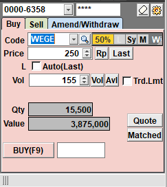 Saya ambil contoh kasus membeli saham dengan kode saham WEGE ( PT. Wijaya Karya Bangunan Gedung Tbk) pada harga saat ini Rp 250 per lembar saham. Untuk 1 Lot saham = 100 Lembar saham. Yang artinya kita bisa membeli saham WEGE di harga 250 sebanyak 155 Lot atau sebanyak 15.500 Lembar saham. Dengan cara anda mengisi form Qoute dengan kode saham WEGE lalu di harga 250 klik kanan dan klik buy maka akan masuk ke dalam form pengisian jumlah Lot dengan perhitungan :