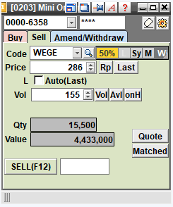 Dan Anda ingin menjual saham ini dengan kenaikan 36 Point atau 36 Rupiah dari selisih saat anda beli dan anda akan jual maka anda tinggal klik kanan di harga saham WEGE lalu sell lalu isi volume apakah ingin menjual semuanya 155 Lot atau di bagi-bagi di harga yang anda inginkan itu bisa asalkan jumlahnya tetep 155 Lot totalnya.