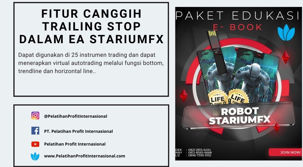 Setelah anda membaca artikel ini, apakah anda tidak tertarik menggunakan robot Trading ? Jangan sia-sia kan kesempatan anda, buruan menggunakan Robot Trading Otomatis dari PT.Pelatihan Profit Internasional yang telah menyediakan Robot Trading Otomatis yaitu StariumFX. StariumFX sendiri adalah robot trading otomatis yang menggunakan strategi martingale sebagai strategi default (dapat diubah ke berbagai strategi seperti Scalping, Averaging, Hedging, Switching dan Trending). Dapat digunakan di 25 instrumen trading dan dapat menerapkan virtual autotrading melalui fungsi bottom, trendline dan horizontal line. Dibangun dengan standar MQL4 dan MQL5 yang memiliki kualitas Enterprise, serta mempunyai fitur-fitur canggih yang dibutuhkan saat trading seperti Trailing Stop, Breakeven, Average Stoplevel.