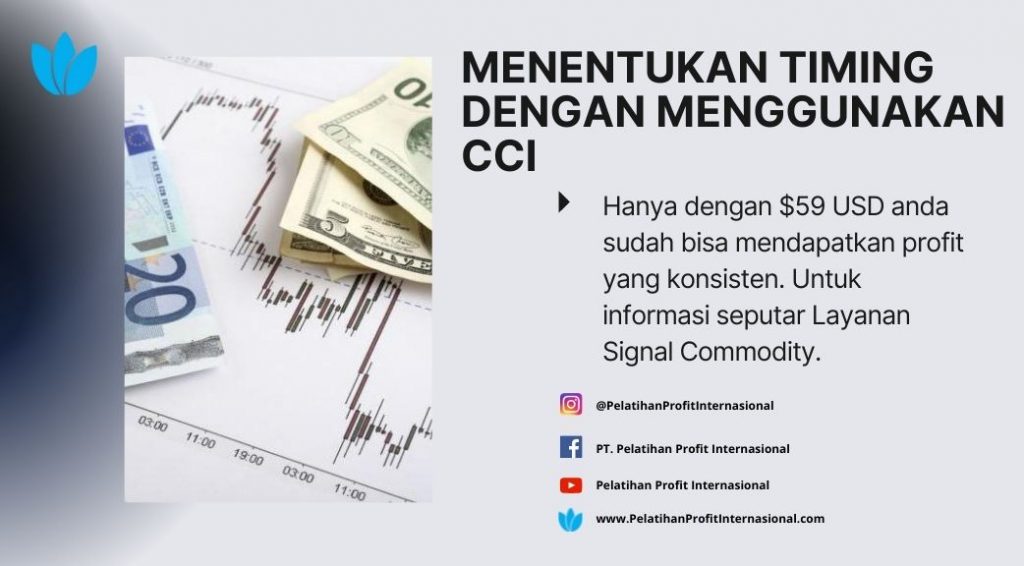 CCI (Commodity Channel Index) merupakan indikator analisis teknikal yang tergolong oscillator yang digunakan untuk mengidentifikasi tren siklikal di sebuah instrumen. Awalnya indikator ini dipakai untuk menganalisis arah harga komoditas, karena CCI bekerja di atas ataupun di bawah skala 0 sehingga termasuk dalam indikator momentum. Dengan demikian, trader dapat bertransaksi di momen yang tepat untuk hasil optimal. CCI juga memiliki 3 komponen didalamnya, seperti garis CCI, area overbought dan area oversold. CCI juga dapat dimanfaatkan sebagai konfirmasi sinyal buy dan sell dengan cara yang cukup sederhana. Sinyal sell adalah ketika garis CCI turun dari area overbought dan turun kebawah level 100, sebaliknya buy adalah ketika garis CCI naik ke area oversold dan naik ke atas level -100. Namun perlu dicatat, sinyal yang valid adalah sinyal yang searah dengan trend. Dasar perhitungan CCI yaitu dengan mengukur hubungan harga dan moving average khususnya deviasi normal dari rata-rata. Jadi momentum timing sangatlah penting dalam trading, bahkan sering kita dengar pendapat soal apapun indikator atau strategi yang digunakan dan timing yang tepat, maka profit akan kita raih.