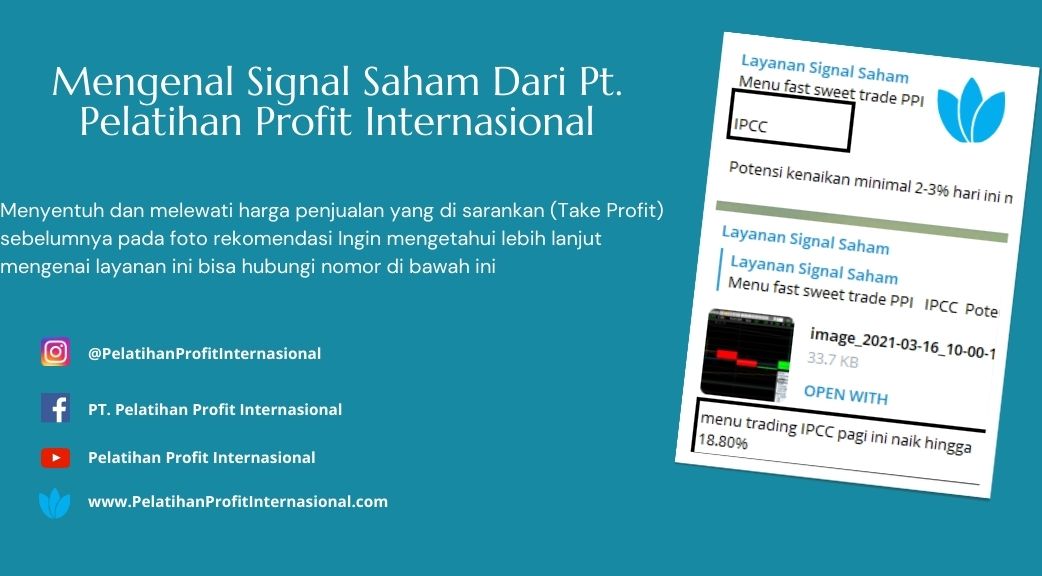 Hallo sahabat investor pada kesempatan kali ini kita akan membahas mengenai layanan signal saham. Mengapa kita bahas? Karena signal saham dari PT. PELATIHAN PROFIT INTERNASIONAL merupakan signal rekomendasi saham yang di berikan setiiap hari untuk para pelaku pasar yang bertransaksi saham. Rekomendasi yang di berikan tentu saja rekomendasi yang sudah melalu riset berupa analisa tehnikal, analisa Bandarmology, analisa Price Value di mana di tunjang juga dengan data-data pendukung dalam memberikan analisa di pasar saham.