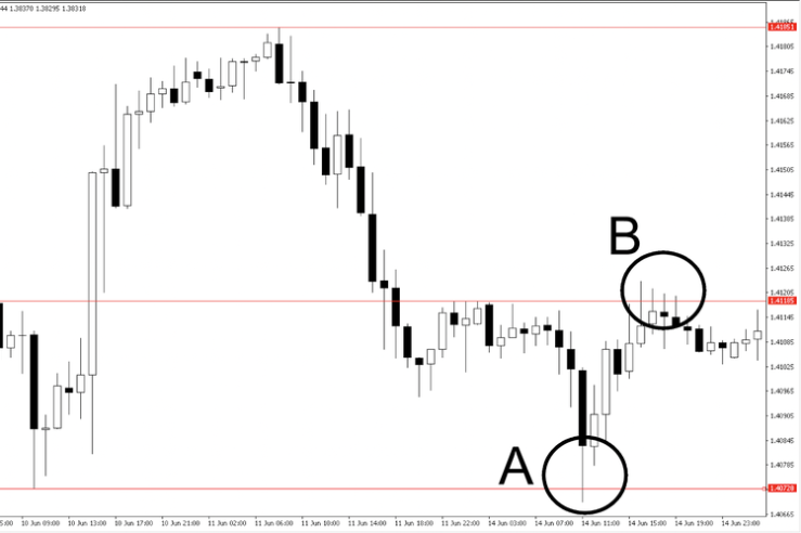 Gambar. 1 : Grafik GBP/USD, mulai 10-14 Juni. Harga terendah dengan huruf A dan harga tertinggi pada huruf B