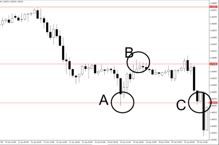 Gambar. 1.2 : Grafik GBP/USD, mulai 10-15 Juni. Harga terendah dengan huruf A dan C serta harga tertinggi pada huruf B
