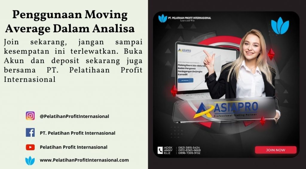 Moving Average adalah Indikator untuk mengetahui pergerakan harga rata rata dalam waktu tertentu. Moving Average bisa digunakan untuk mengetahui arah trend pergerakan harga dan juga bisa digunakan sebagai support dan resistance yang dinamis. Moving Average dapat memperkirakan pergerakan rata-rata aritmetika yang dihitung dengan menambahkan harga penutupan dalam beberapa periode waktu dan membaginya dengan jumlah periode waktu. Pada umumnya trader memperhatikan rata-rata jangka pendek untuk melewati diatas rata-rata jangka panjang, sinyal inilah yang dianggap penanda awal akan terjadi tren naik dan rata-rata jangka pendek berfungsi sebagai pendukung ketika harga mengalami penurunan. Indikator ini tersedia di semua platform trading, bahkan menjadi indikator default yang terpasang di chart. Banyak trader yang memanfaatkan fungsi Moving Average, karena inilah indikator yang biasanya mereka kenal pertama kali. Terdapat satu permasalahan pada Moving Average, yaitu rentan terhadap lonjakan. Ketika hal ini terjadi, maka akan timbul sebuah sinyal palsu pada chart yang kita amati. Dengan demikian, kita dapat berpikir bahwa tren baru akan segera berkembang, tetapi dalam kenyataannya tidak ada yang berubah. Saat setiap periodenya berakhir maka poin-poin data yang terlamanya di hilangkan dan yang terbaru ditambahkan di bagian permulaannya.