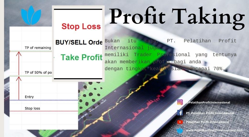 Profit Taking adalah sebuah aksi mengambil untungdalam jangka pendek dengan cara menjual di harga yang lebih tinggi daripada harga belinya dengan memanfaatkan situasi tertentu. Penentuan level profit taking berfungsi untuk menentukan target teknikal akan keuntungan yang anda raih, sehingga ketika harga bergerak pada nilai yang anda harapkan, posisi akan ditutup secara otomatis. Dengan merealisasikan keuntungan, berarti anda sedang melindungi keuntungan anda dan mencegah keuntungan tersebut berubah menjadi kerugian. Jika market melanjutkan really setelah anda merealisasikan keuntungan, anda tidak perlu menyesal karena anda sudah memperoleh keuntungan ditangan anda. Namun tetapkan level profit taking anda sesuai dengan potensi yang ditawarkan oleh market dan bersikaplah disiplin pada level yang telah anda tetapkan tersebut.
