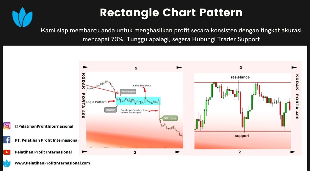 Tembusnya batas atas (resisten) pola rectangle pada sebuah uptrend dapat dijadikan pertanda bahwa tren naik akan kembali berlanjut. Namun sebaliknya, pergerakan reversal akan terjadi jika batas bawah (support) dari pola rectangle pada sebuah uptrend berhasil ditembus. Dalam membaca pola rectangle, sinyal entri utama untuk persegi panjang adalah menunggu harga breakout (menembus ke luar pola rectangle). Jika harga menembus baik garis support atau resistance, trading sesuai arah breakout, dengan proteksi stop loss tepat di dalam pola rectangle. Pergerakan harga menembus (breakout) pola rectangle divalidasi saat volume meningkat saat breakout. Volume harus minimal 33% sampai 50% lebih tinggi saat breakout; Jika tidak, itu mungkin merupakan false breakout. Pola Rectangle terbagi menjadi dua bagian, seperti Bearish Rectangle yang merupakan sebuah pola yang terbentuk karena harga sedang konsolidasi setelah adanya pergerakan harga yang cenderung menurun atau downtrend. Sedangkan Bullish Rectangle yang merupakan kebalikan dari Bearish Rectangle, yang merupakan pola ketika mengalami pergerakan harga yang cenderung naik atau uptrend setelah beberapa saat mengalami konsolidasi.
