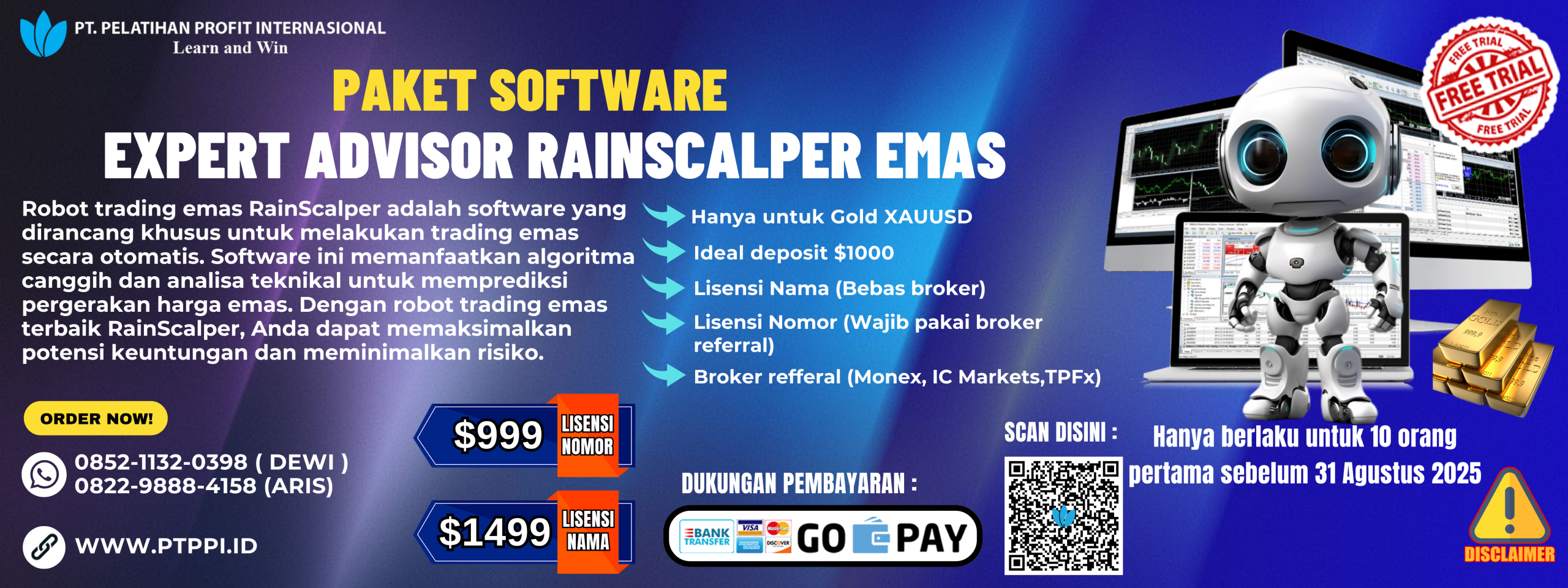 Harga normal biaya riset RainScalper emas ini $3799. Promo bagi 10 pendaftar pertama sebelum 31 Agustus 2025 bagi member ICMarkets, Monex dan TPFX. hanya $999 dan $1499 untuk versi nama bisa dipakai bebas broker dan unlimited account.