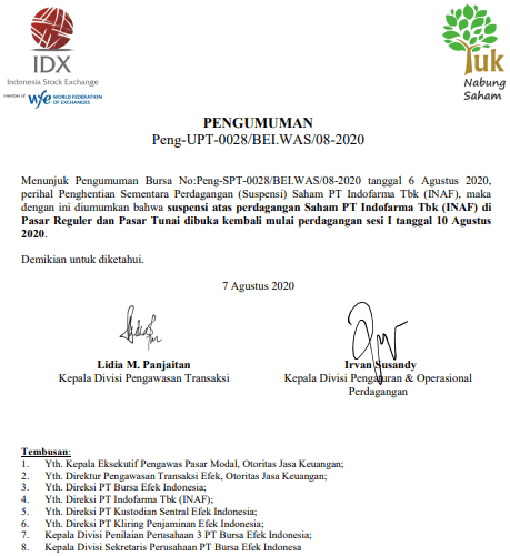 Tapi intinya, ketika saham yang anda pegang disuspensi, maka dana anda tidak kemana-mana, karena suspensi tersebut hanya sementara. Anda akan bisa mencairkannya, segera setelah suspensinya dicabut. Cuman memang masalahnya kita nggak pernah tahu, kapan suspensi itu dicabut. Jika pelanggarannya memang berat, maka suspensinya bisa cukup lama.