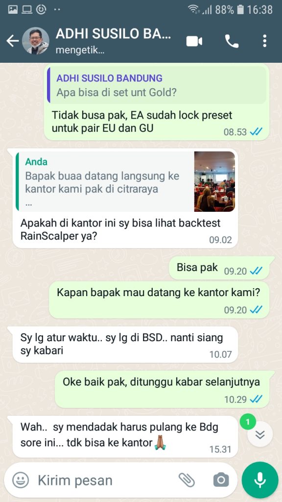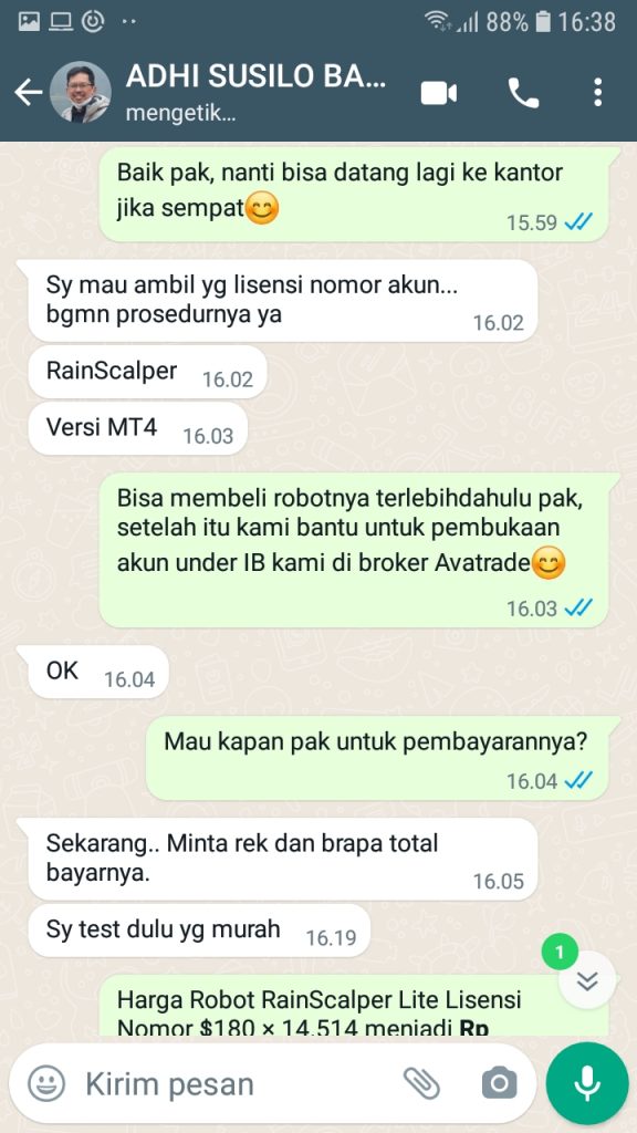 Terima kasih Bapak Adhi Susilo dari Bandung atas pemesanan EA RainScalper Lite sebesar $180 USD menjadi Rp. 2.612.520,-. Semoga Bapak profit terus menggunakan Robot RainScalper Lite kami, AMIN.
