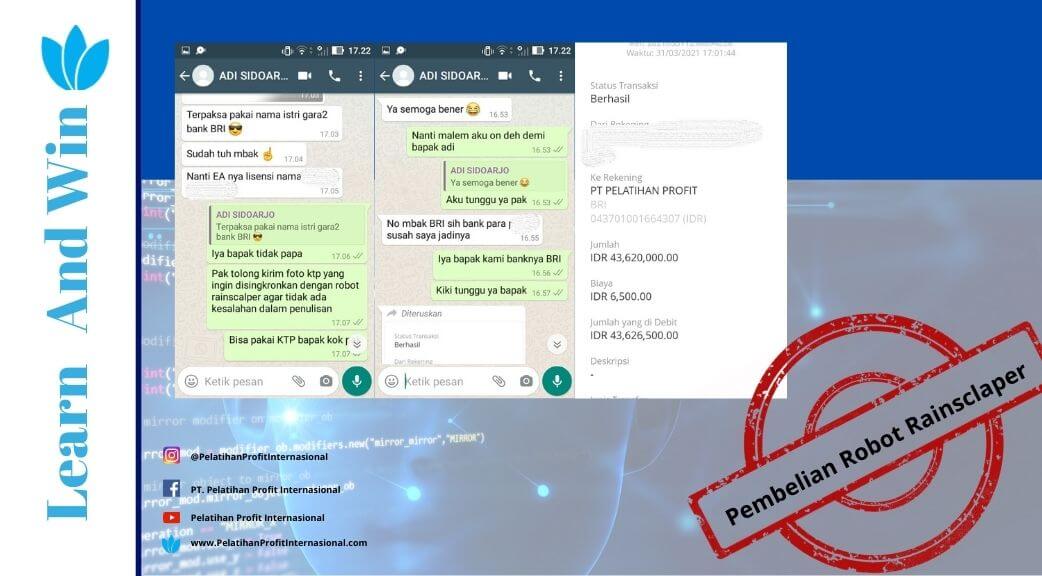 Terima Kasih Bapak Adi Di Sidoarjo Atas Pembelian Robot Rainscalper Seharga $3000 USD × 14.540 menjadi Rp.43.620.000,- . Semoga Bapak profit terus menggunakan Robot RainScalper kami, AMIN.