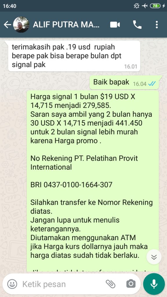 Terima Kasih Bapak Alif Putra Dari Malaysia Atas Langganan Signal Forex Selama 1 bulan sebesar Rp.280.000,00 berlaku sampai dengan 3 September 2020. Semoga profitnya berlipat-lipat dan berlanjut langganan Signalnya yang lebih panjang lagi. AMIN.