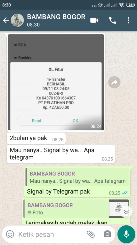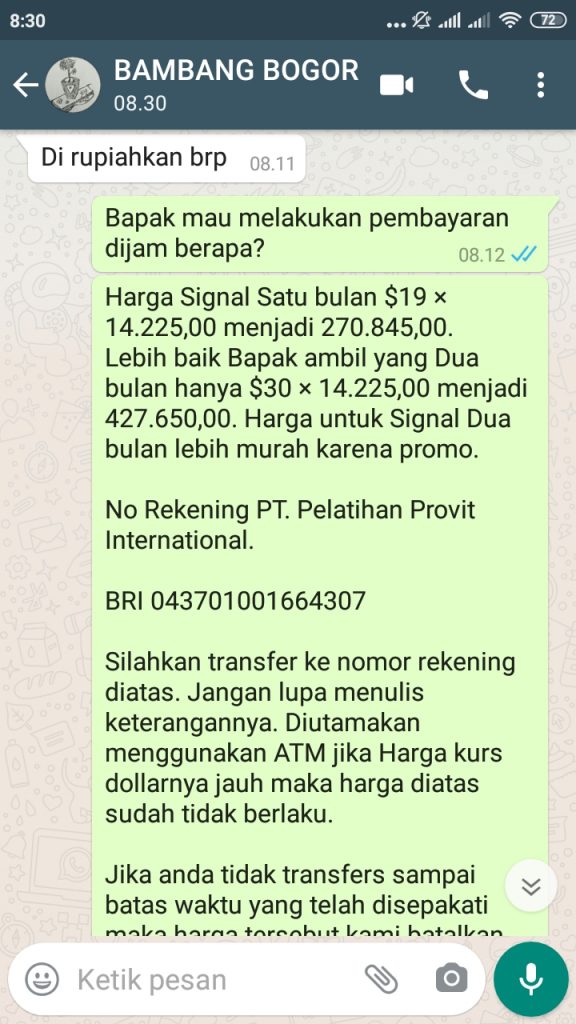 Terima kasih Bapak Bambang dari Bogor atas Langganan Signal Index selama 2 bulan sebesar Rp. 427.650,00 yang berlaku sampai dengan 9 Januari 2021. Semoga profitnya berlipat-lipat dan berlanjut, agar dapat berlangganan Signal yang lebih panjang lagi. AMIN.