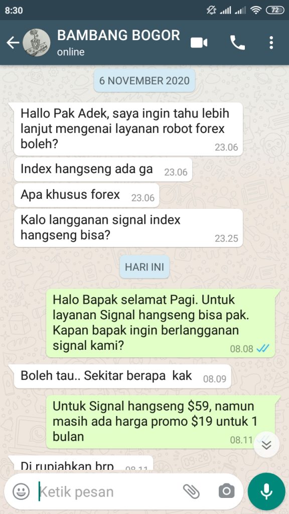 Bagi yang ingin melihat contoh dan bukti akurasi, kami akan kirim Via Whatsapp. Dengan cara klik nomor Whatsapp dibawah ini, lalu ketik “CONTOH SIGNAL INDEX“