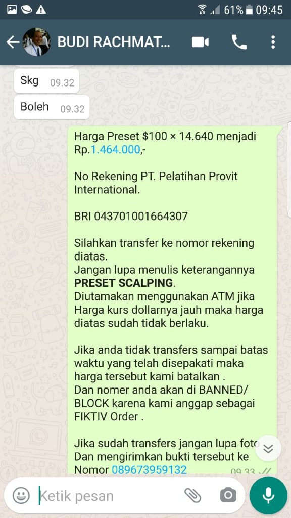 Terima kasih Bapak Budi dari Jakarta atas pembayaran Preset Scalping sebesar $100 USD menjadi Rp. 1.464,000-. Semoga preset yang sudah diupdate semakin memberikan profit lebih banyak dan semakin baik.