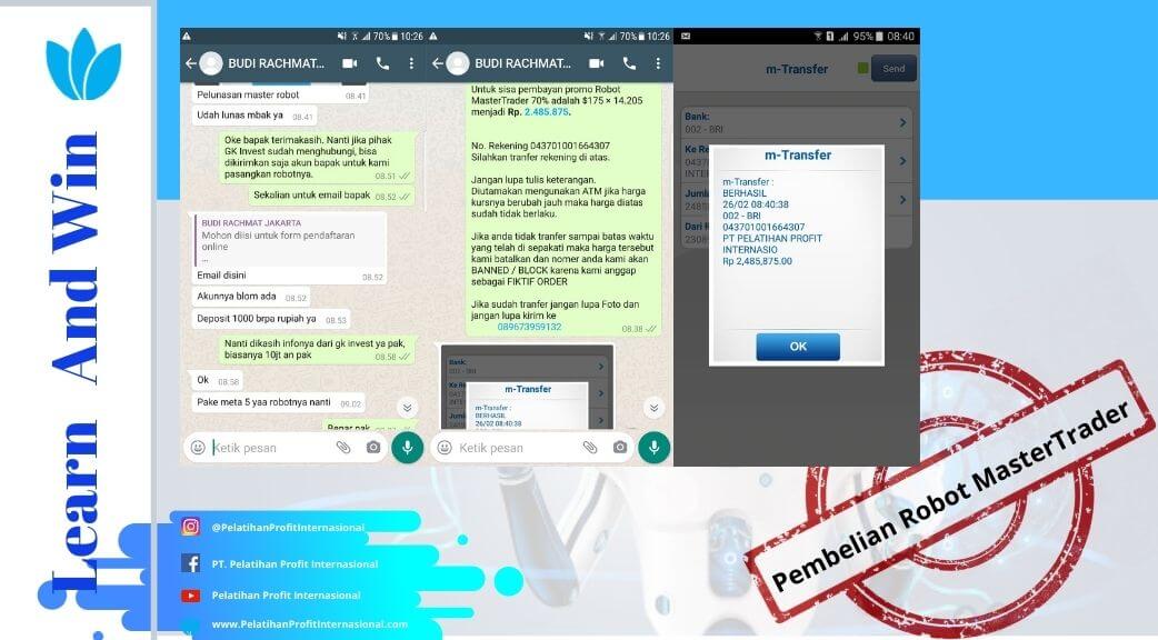 Terima Kasih Bapak Budi Rachmat Dari Jakarta Atas Pelunasan 70% Pemesanan EA Master Trader $250 menjadi Rp. 2.485.875,-. Semoga Bapak profit terus menggunakan Robot Master Trader kami, AMIN.