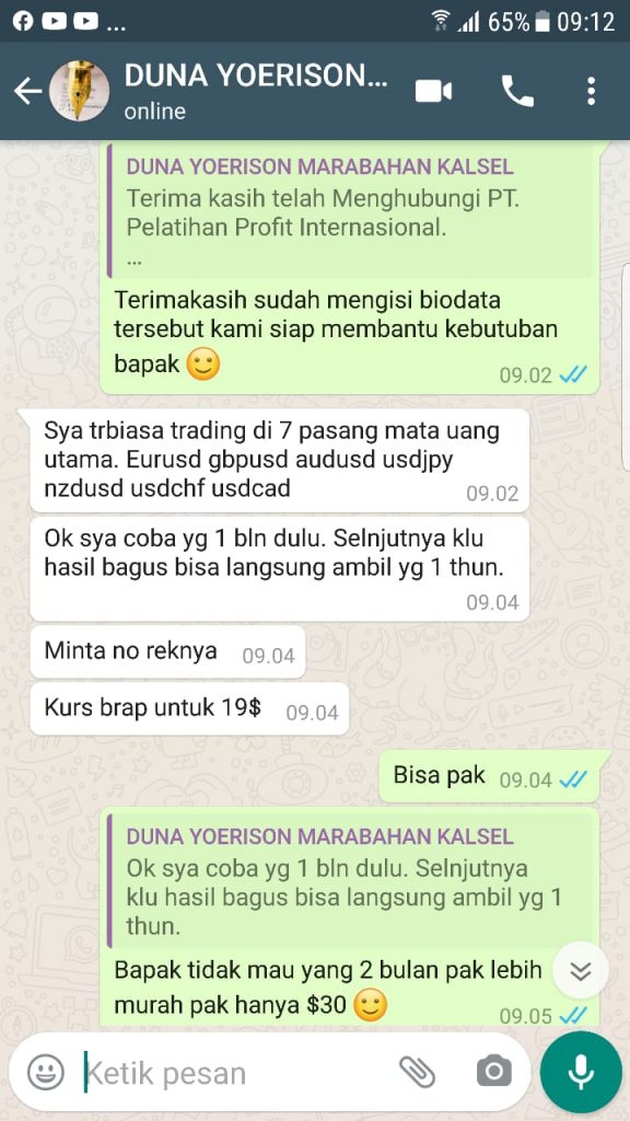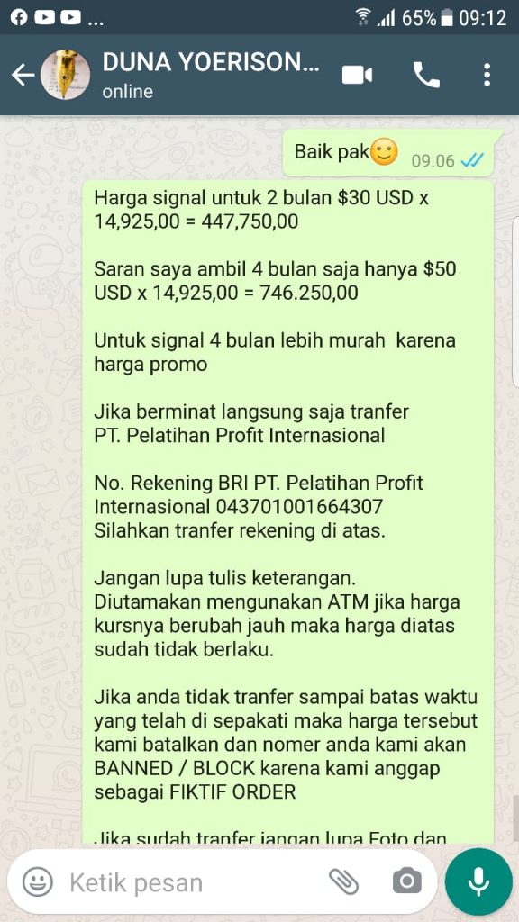 Terima Kasih Bapak Duna Dari Marabahan Kalsel Atas Langganan Signal Forex Selama 2 Bulan sebesar Rp. 447.750 berlaku sampai dengan 14 Oktober 2020. Semoga profit nya terus berlanjut dan berlipat lipat ya. Supaya bisa langganan Signal yang lebih panjang lagi. Aamiin