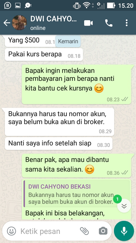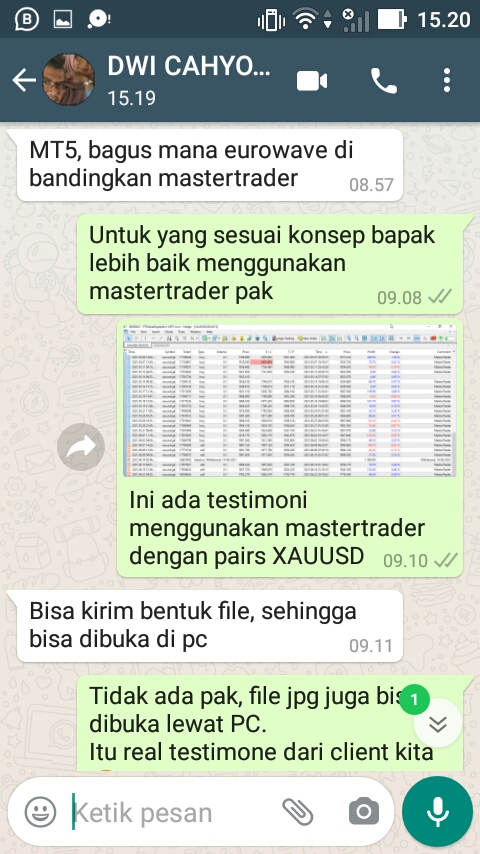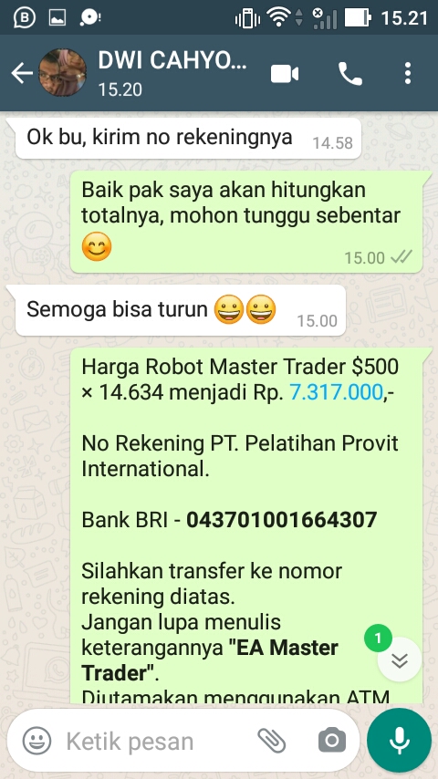 Terima Kasih Bapak Dwi Cahyono Dari Bekasi Atas Pemesanan Ea Master Trader Seharga $500 menjadi Rp. 7.317.000,-. Semoga Bapak profit terus menggunakan Robot Master Trader kami, AMIN.