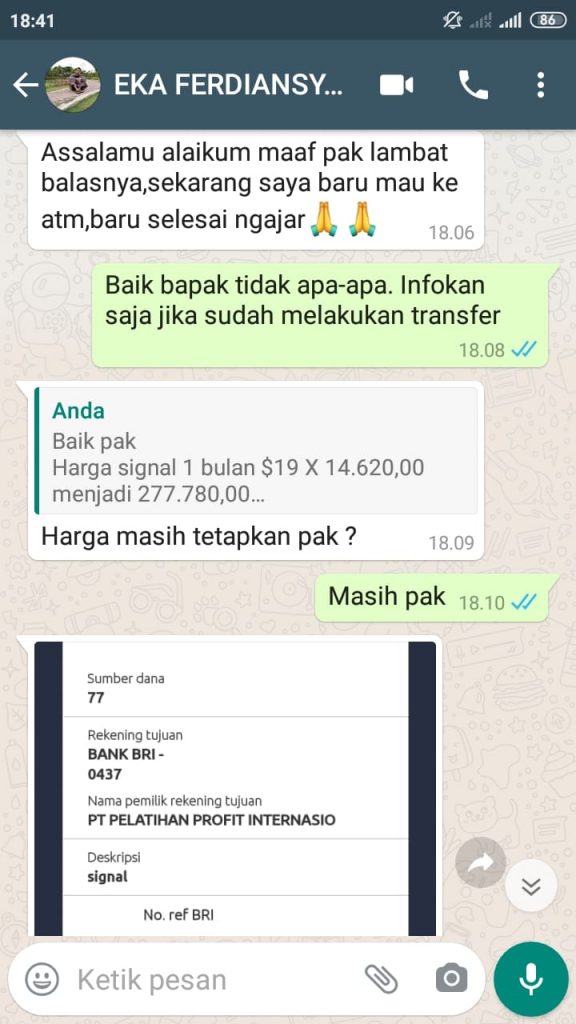 Terima Kasih Bapak Eka Ferdiansyah Dari Riau Atas Langganan Signal Forex Selama 1 Bulan sebesar Rp.277.780,00 berlaku sampai dengan 28 Agustus 2020. Semoga profitnya berlipat-lipat dan berlanjut langganan Signalnya yang lebih panjang lagi. AMIN.