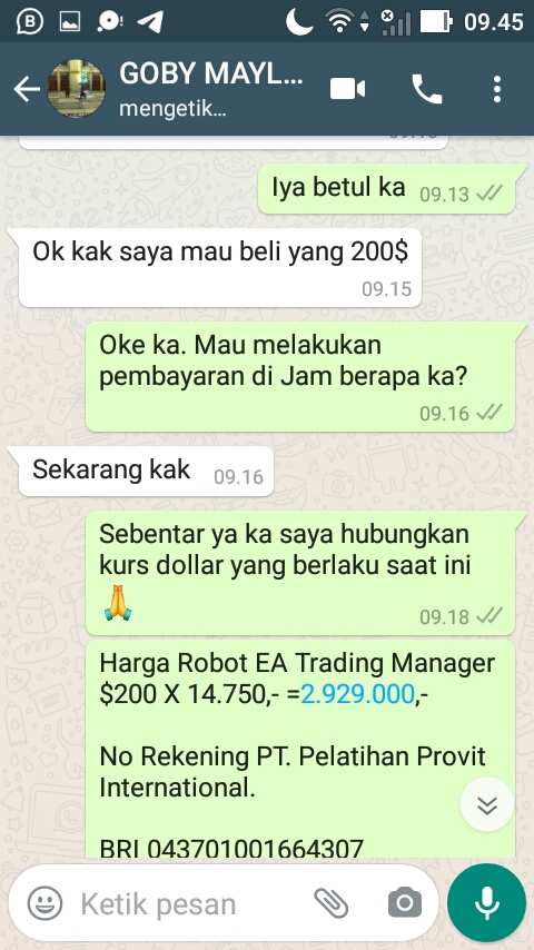 Terima Kasih Bapak Goby Maylandy Dari Bandar Lampung Atas Pemesanan EA Trader Manager Sebesar $200 menjadi Rp. 2.929.000,-. Semoga Bapak profit terus menggunakan Robot Trader Manager kami, AMIN.