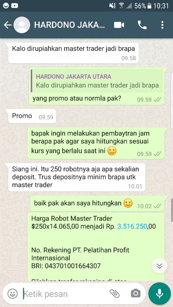 Terima Kasih Bapak Hardono Dari Jakarta Utara Atas Pemesanan Ea Master Trader sebesar $250 USD menjadi Rp. 3.516.250,00 Semoga Bapak profit terus menggunakan Robot Master Trader kami, Aamiin. Semoga profit nya terus berlanjut dan berlipat lipat ya supaya bisa menggunakan tool kami yang lain. AMIN.