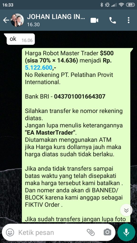 Terima Kasih Bapak Johan Dari Jakarta Atas Pemesanan Robot Mastertrader Sebesar $500 ( Pelunasan 70% atau $350 ) menjadi Rp.5.122.600,-. Semoga Bapak profit terus menggunakan Robot Master Trader kami, AMIN.