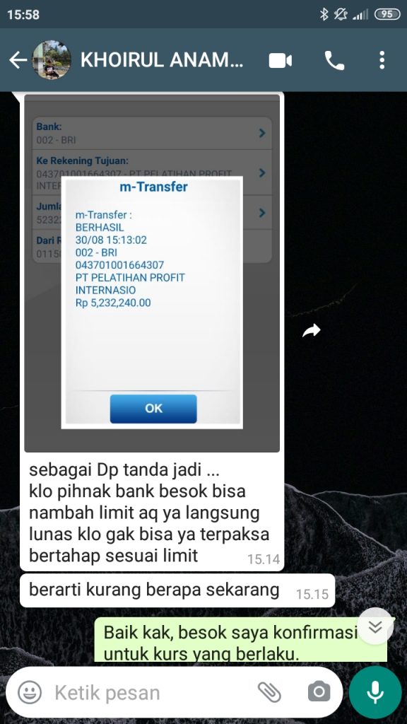 Terima Kasih Bapak Khoirul Anam Dari Malang Atas Pemesanan Ea Rainscalper Sebesar $3.600 Usd menjadi Rp. 52.322,400,-. Semoga Bapak profit terus menggunakan Robot RainScalper kami, AMIN.