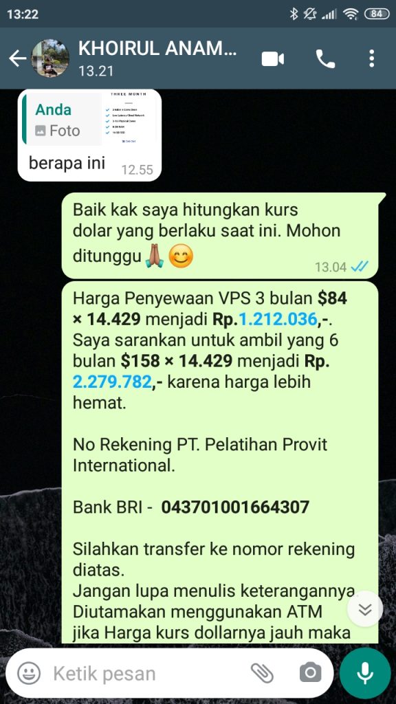 Terima Kasih Bapak Khoirul Anam Dari Malang Atas Penyewaan Vps Enterprise Sebesar $84 Usd menjadi Rp. 1.212.036,-. Semoga Bapak profit terus, AMIN. Untuk informasi lebih lengkap VPS Enterprise, klik link dibawah ini: