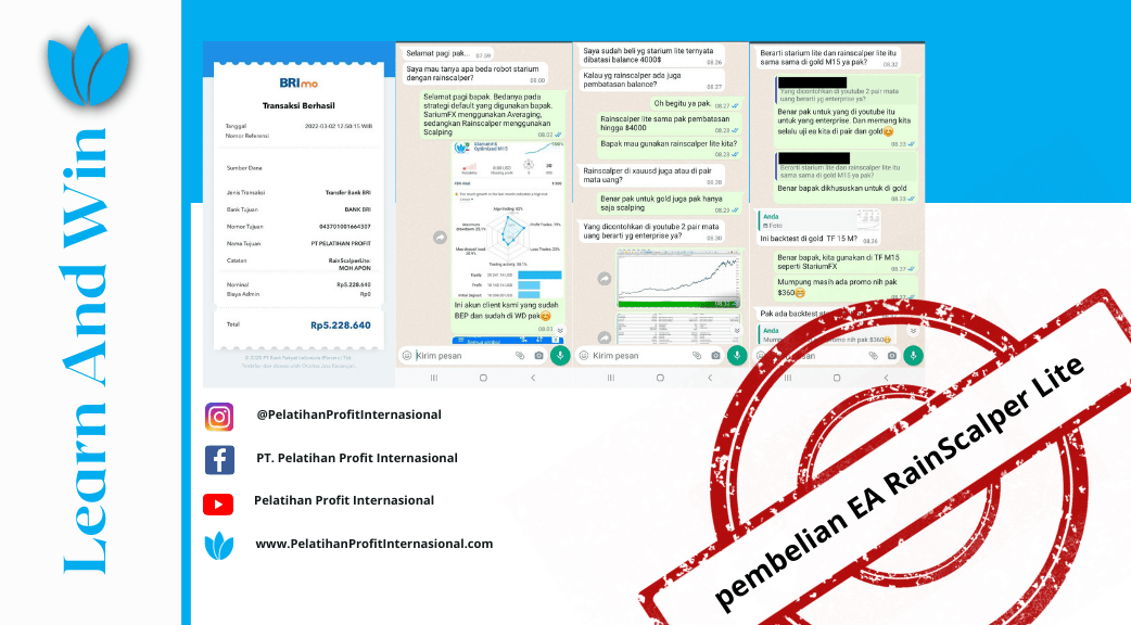 Terima kasih Bapak M.A** dari Jakarta atas pemesanan EA RainScalper Lite sebesar $360 USD menjadi Rp. 5.228.640,-. Semoga Bapak profit terus menggunakan Robot RainScalper Lite kami, AMIN.