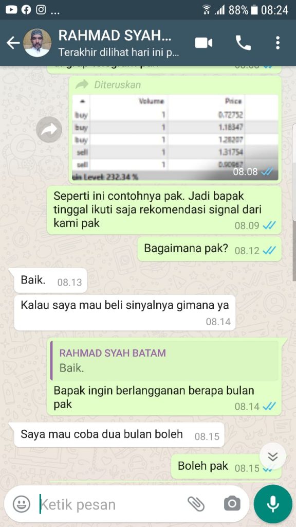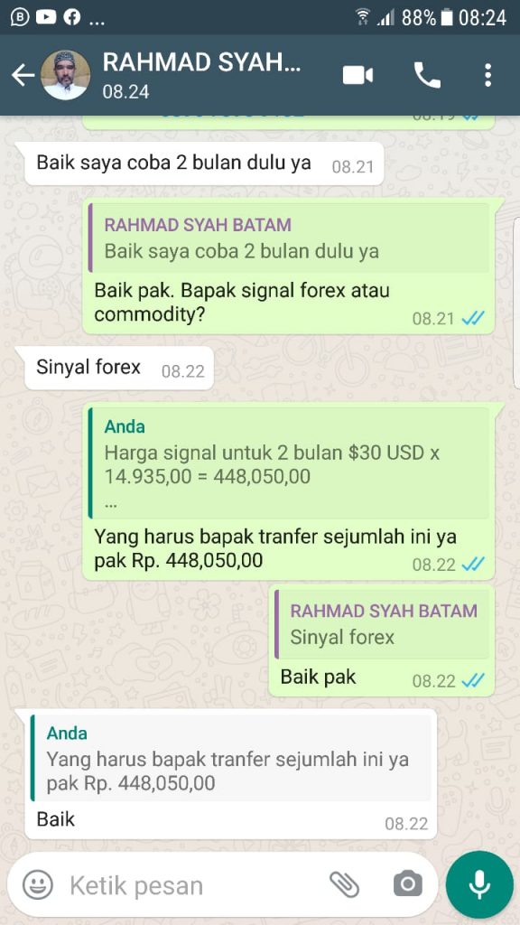 Terima Kasih Bapak Rahmad Syah Dari Batam Atas Langganan Signal Forex Selama 2 Bulansebesar Rp.448,050,00 berlaku sampai dengan 14 November 2020. Semoga profit nya terus berlanjut dan berlipat lipat ya. Supaya bisa langganan Signal yang lebih panjang lagi. Aamiin