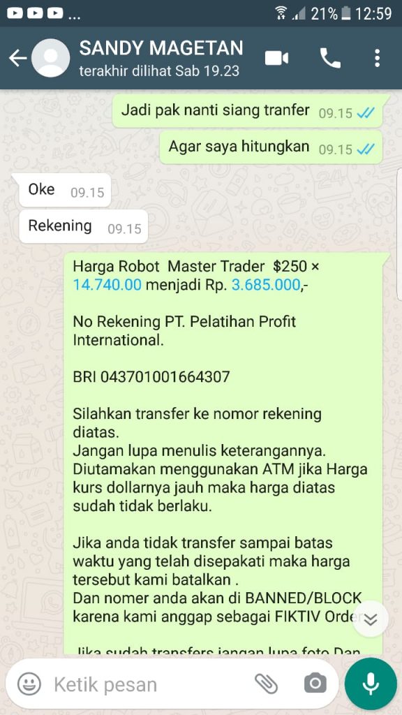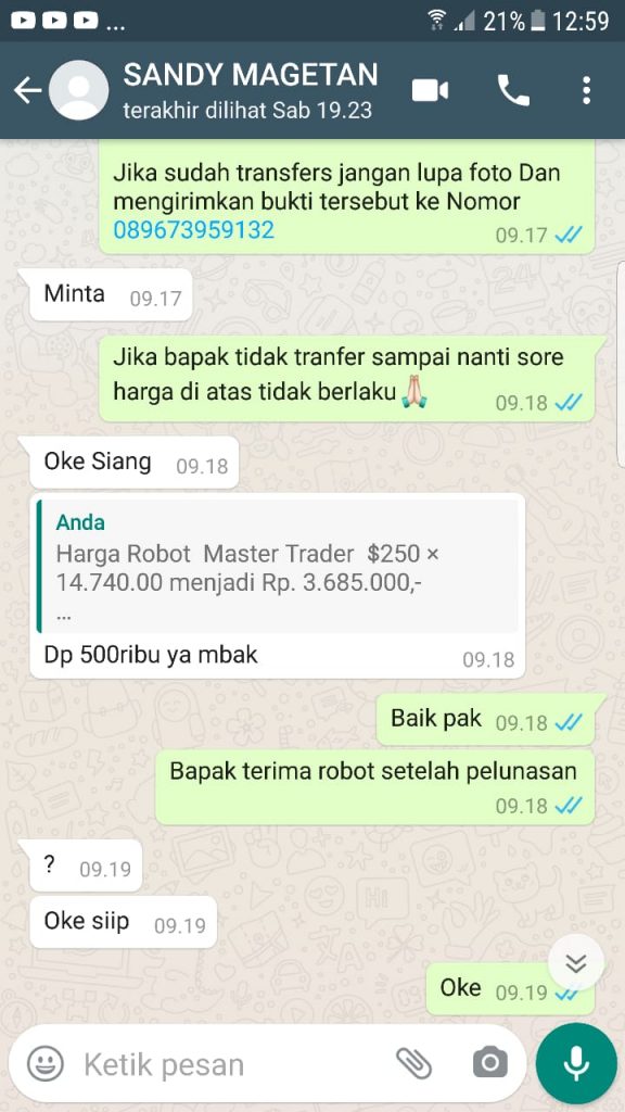 Terima Kasih Bapak Sandy Dari Magetan Atas Pemesanan Dan Pelunasan Ea Master Trader sebesar $250 USD menjadi Rp. 3.685.000 Semoga Bapak profit terus menggunakan Robot Master Trader kami, Aamiin