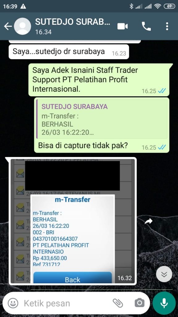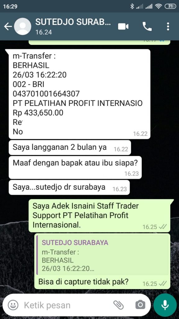 Terima Kasih Bapak Sutedjo Dari Surabaya Atas Langganan Signal Saham Selama 2 Bulan sebesar Rp. 433.650,- berlaku sampai dengan 29 Mei 2021. Semoga profitnya berlipat-lipat dan berlanjut langganan Signalnya yang lebih panjang lagi. AMIN.