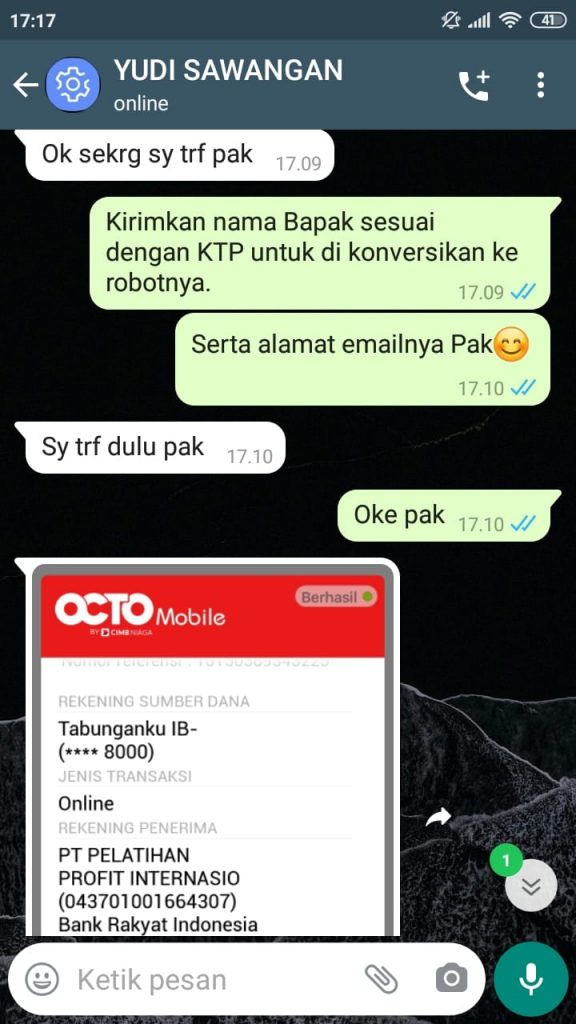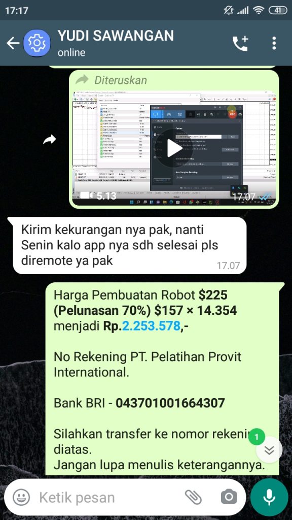 Terima Kasih Bapak Yudi Dari Sawangan Atas Pemesanan Jasa Pembuatan Ea Sebesar $225 Usd (Pelunasan 70% $157 menjadi Rp.2.253.578,-. Semoga profit terus dengan menggunakan Robot Trading yang Bapak miliki saat ini.Semoga profit nya terus berlanjut dan berlipat lipat ya supaya bisa menggunakan tool kami yang lain. Yukk jadikan trading anda lebih mudah