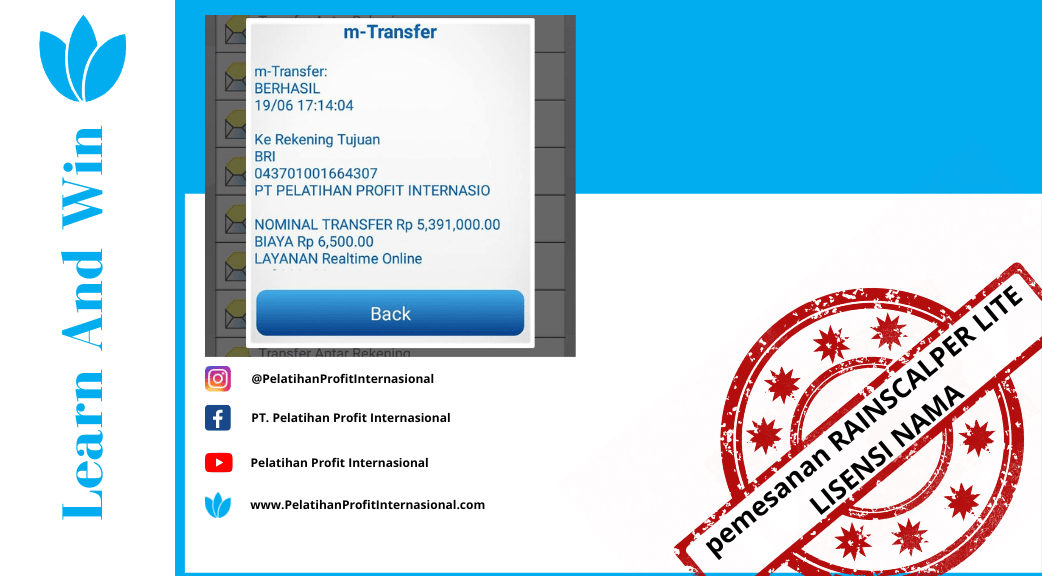 Terima kasih Kak BOBY DANNMOGOT atas pemesanan RAINSCALPER LITE LISENSI NAMA sebesar $360x 14.974,00 menjadi Rp. 5.390,640,00. Semoga Kakak profit terus menggunakan Robot RAINSCALPER kami, AMIN.