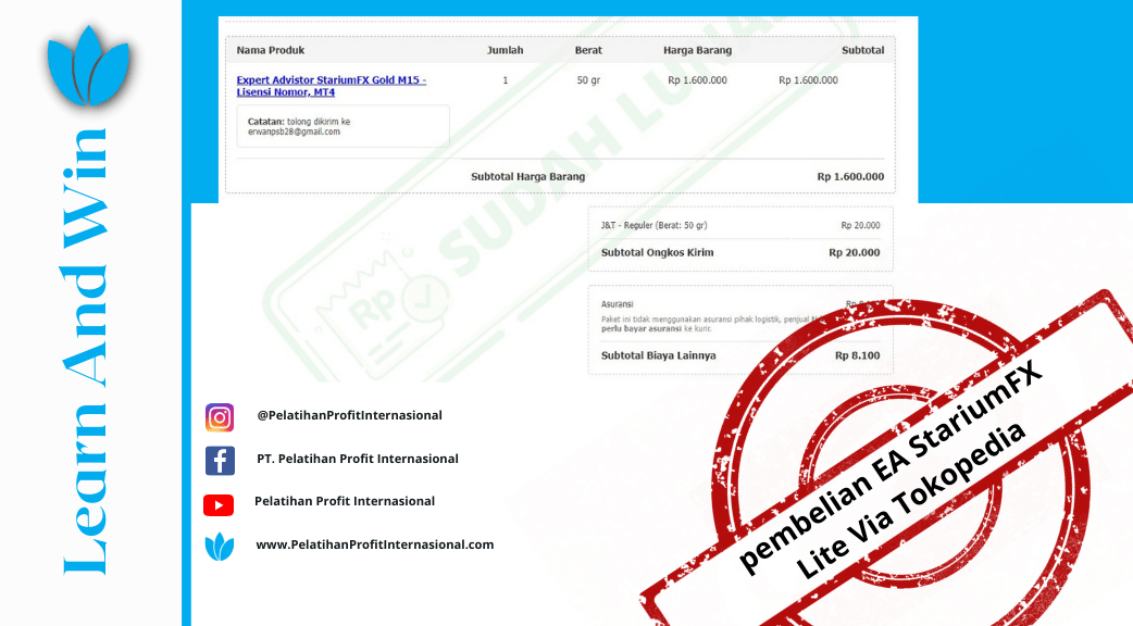 Terima kasih Kak Erwan atas pembelian Robot StariumFX Lite Lisensi Nama sebesar *Rp.1.600.000,00. via Tokopedia Semoga profit terus dengan menggunakan Robot StariumFX Lite kami.