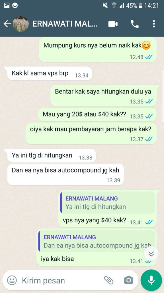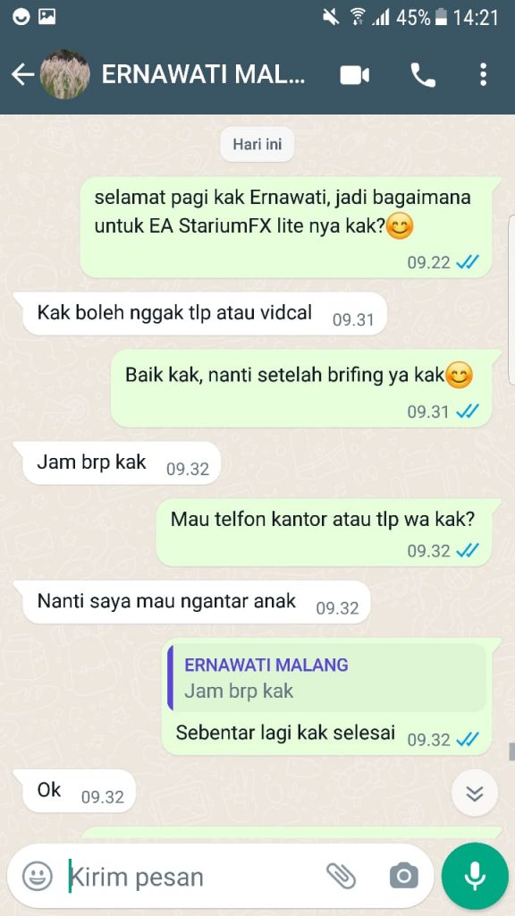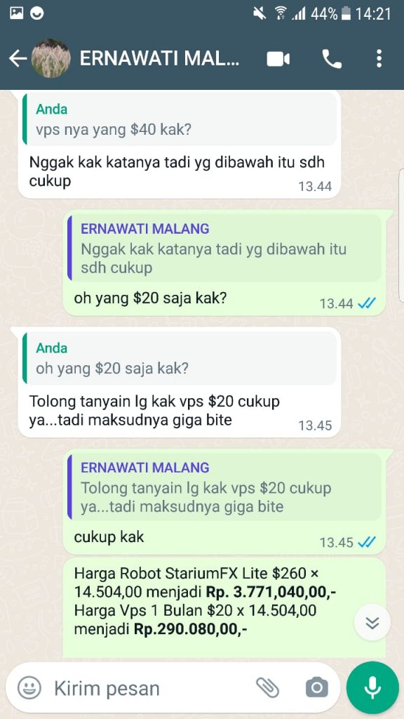 Terima Kasih Kakak Ernawati dari Malang atas pembelian EA StariumFX Lite sebesar $260 USD menjadi Rp 3.771.040,- dan VPS RDP 1 bulan sebesar $20 Rp.290.080,- semoga profit terus menggunakan Robot Trading yang Bapak miliki saat ini.
